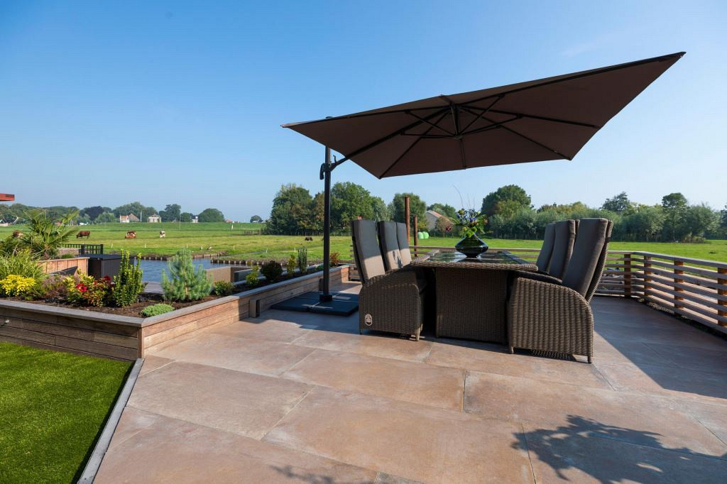 - Vuil verwijder je simpel met de tuinslang en de bezem.