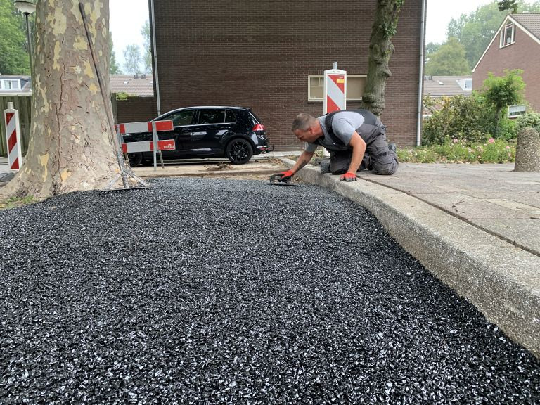 Werk alleen met schoon siersplit of siergrind. Spoel het stof van het grind en laat het vervolgens goed opdrogen voordat u de 2-componenten toevoegt.