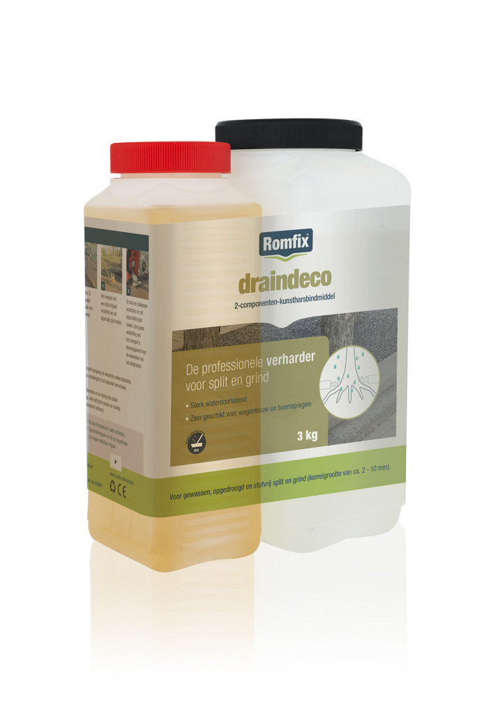 ROMFIX draindeco staat ook bekend als een siergrind- en splitbinder. Het is een 2-componenten kunsthars die wordt gebruikt om siergrind of siersplit te verbinden ‘verlijmen’. Dit zien we vaak bij het afwerken van een boomspiegel, parkeervakken, dakterrassen, looppaden welke mindervalide proof behoren te zijn, bij drupranden in het geval van een rieten kap en meer situaties in de openbare ruimte. De Draindeco splitbinder voorkomt onkruidgroei, is waterdoorlatend en houdt het split of grind schoon voor de lange termijn. Dit voegmiddel is kant-en-klaar en eenvoudig te verwerken zonder toevoeging van water. Bijkomend voordeel is een vermindering van vandalisme, onderhoud en een duurzaam en strak eindresultaat voor uw boomspiegel.