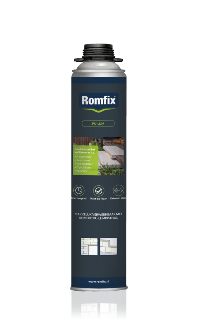 ROMFIX® PU-lijm is geschikt voor het verlijmen van onder andere natuursteen, betonsteen, kalkzandsteen, gipsblokken en keramiek. ROMFIX® PU-lijm is een montage- en steenbevestiging met extreem snel hechteffect waarmee alle soorten steen, keramiek en graniet kunnen worden verlijmd. ROMFIX® PU-lijm kan zowel binnen als buiten worden gebruikt. ROMFIX® PU-lijm droogt zeer snel en heeft een extreem hoge treksterkte. ROMFIX® PU-lijm is zeer eenvoudig te gebruiken en in de juiste hoeveelheid te doseren met het ROMFIX® PU-lijmpistool. ROMFIX® PU-lijm kan voor vele toepassingen gebruikt worden zoals het bevestigen van wanden, plantenbakken, vijverranden, verkeersdrempels, hout, metaal, rubber etc.