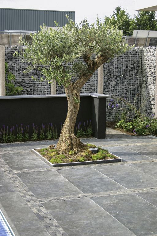 De tuintegels hebben een getrommelde rand en de oppervlakte is verzoet. De donker blauwe kleur verkleurt in de loop der jaren naar een hele mooie natuurlijke grijs/blauwe tint.