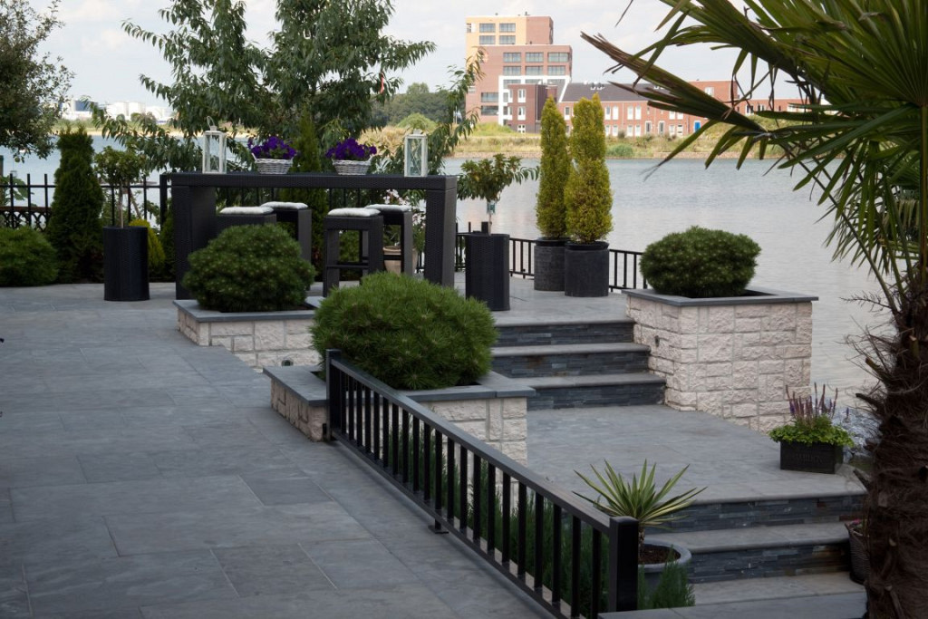 De tuintegels hebben een getrommelde rand en de oppervlakte is verzoet. De donker blauwe kleur verkleurt in de loop der jaren naar een hele mooie natuurlijke grijs/blauwe tint.