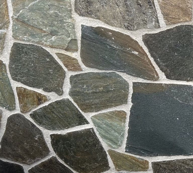 Kwartsiet Flagstones Olive zijn natuurlijke breukstenen met een bijzondere mix van groentinten, aangevuld met subtiele nuances van grijs en bruin. Deze kleurstelling geeft een rustige, natuurlijke uitstraling die perfect aansluit bij groene en organische tuinontwerpen.