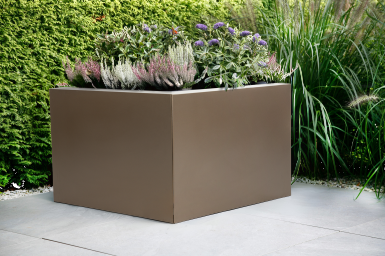 In supra bruin straalt de bak warmte en elegantie uit. De kleur doet denken aan aarde en brons en sluit prachtig aan bij hout, steen en groene beplanting. De matte poedercoating draagt bij aan bescherming tegen krassen bij normaal gebruik en tegen weersinvloeden, zodat de rijke, bruine tint langdurig zijn karakter behoudt.