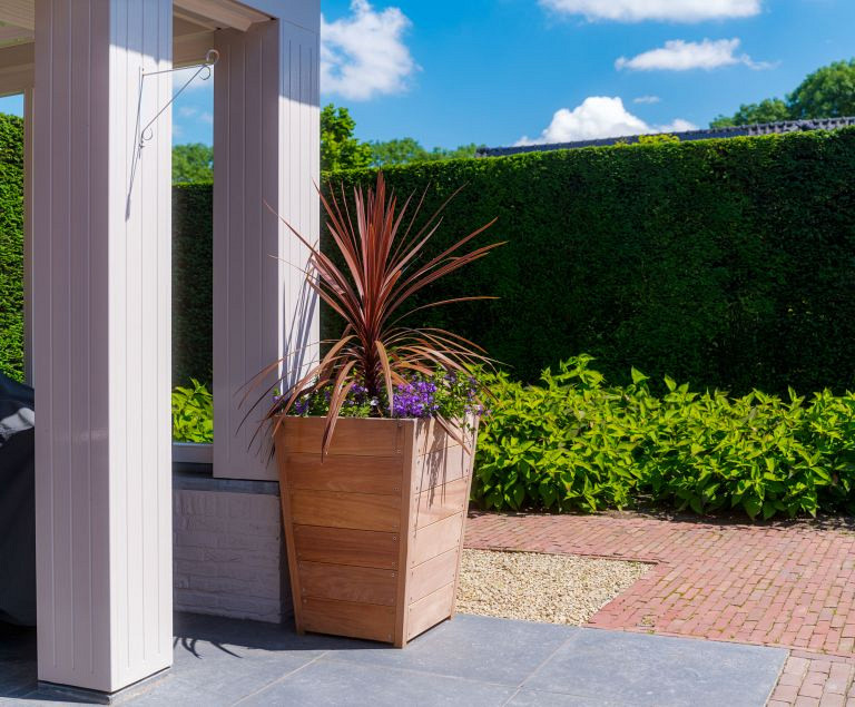 De vierkant tapse vorm van de TAP zorgt voor een chique uitstraling. Dit houten exemplaar sluit uitstekend aan op projecten met vierkante plantenbakken.