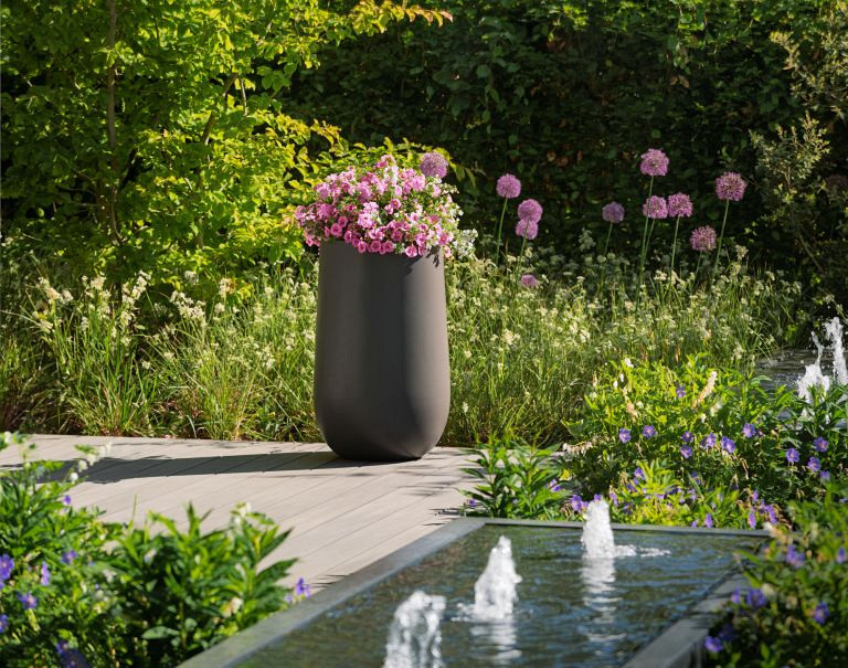 De ronde vorm brengt rust, balans en design. Of hij nu op een houten terras staat of gecombineerd wordt met natuurlijke materialen, LORA past altijd. Het strak afgewerkte design loopt met een hoek naar binnen aan de bovenkant en speelt met volume: brede onderkant, sierlijk in het midden en subtiel uitlopend boven. Perfect voor een moderne tuin met een warme, natuurlijke uitstraling.