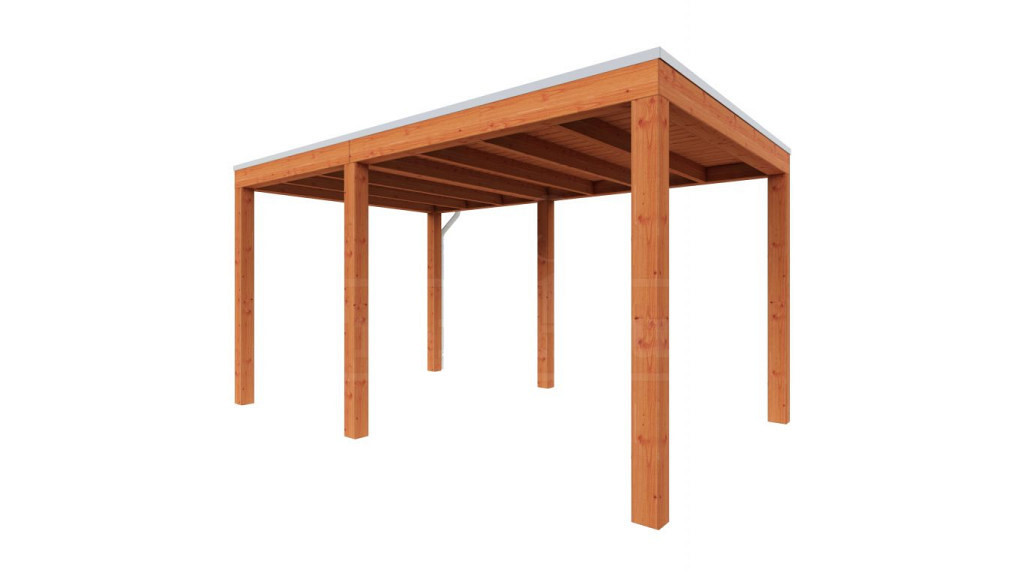 Gemaakt van onbehandeld, kunstmatig gedroogd en geschaafd Douglas-hout. Staanders van 145×145 mm, ringbalken 145×190 mm, rechte schoren, gordingbalken en dakbeschot met degelijke EPDM rubberfolie voor het plat dak. Aluminium daktrim en PVC hemelwaterafvoer inbegrepen. - Varianten & afmetingen