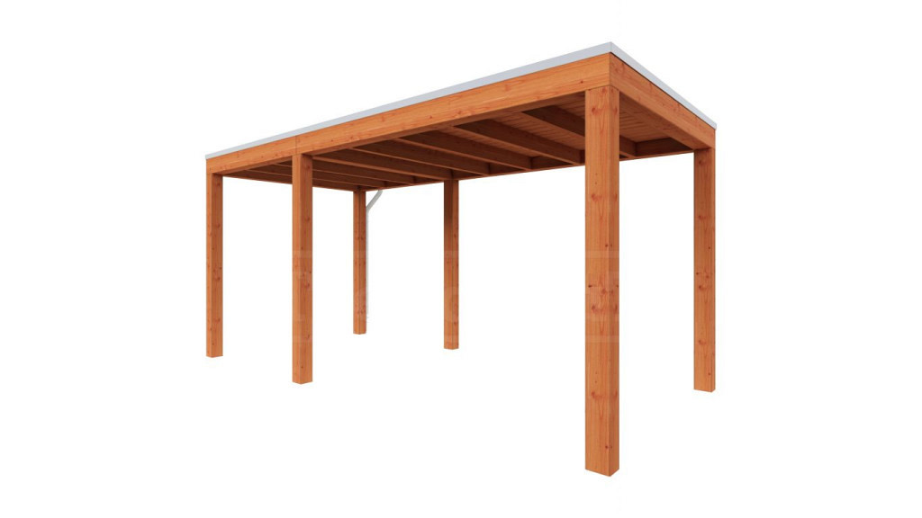 Gemaakt van onbehandeld, kunstmatig gedroogd en geschaafd Douglas-hout. Staanders van 145×145 mm, ringbalken 145×190 mm, rechte schoren, gordingbalken en dakbeschot met degelijke EPDM rubberfolie voor het plat dak. Aluminium daktrim en PVC hemelwaterafvoer inbegrepen. - Varianten & afmetingen