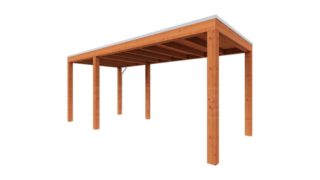 Gemaakt van onbehandeld, kunstmatig gedroogd en geschaafd Douglas-hout. Staanders van 145×145 mm, ringbalken 145×190 mm, rechte schoren, gordingbalken en dakbeschot met degelijke EPDM rubberfolie voor het plat dak. Aluminium daktrim en PVC hemelwaterafvoer inbegrepen. - Varianten & afmetingen
