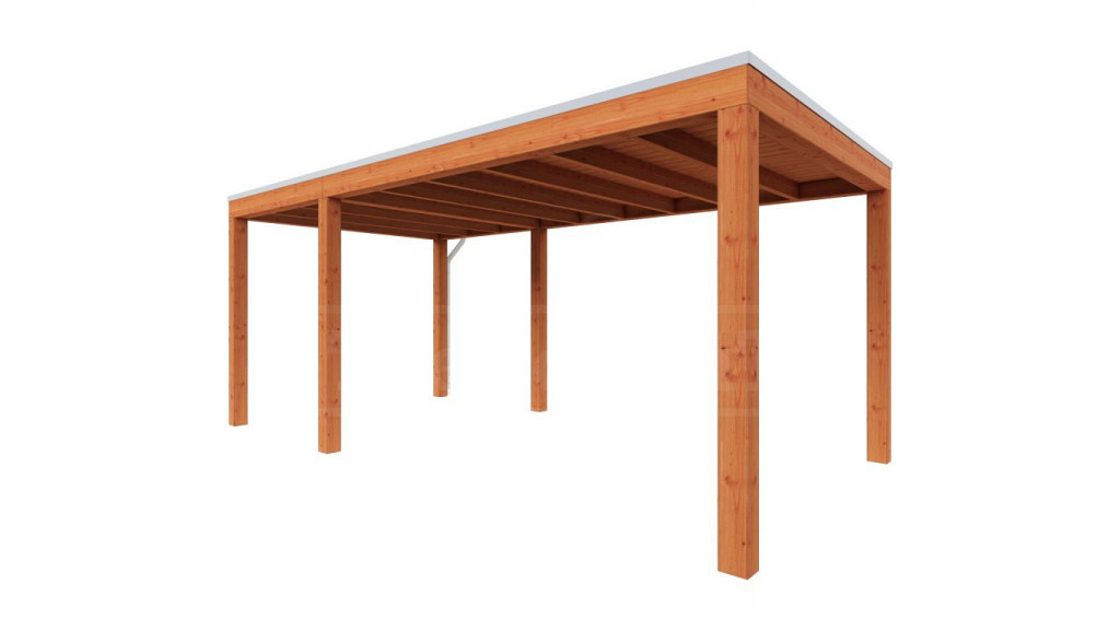 Gemaakt van onbehandeld, kunstmatig gedroogd en geschaafd Douglas-hout. Staanders van 145×145 mm, ringbalken 145×190 mm, rechte schoren, gordingbalken en dakbeschot met degelijke EPDM rubberfolie voor het plat dak. Aluminium daktrim en PVC hemelwaterafvoer inbegrepen. - Varianten & afmetingen